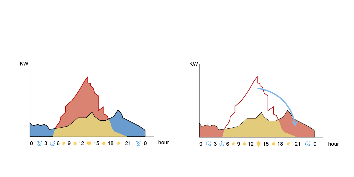 Utilizzando pannelli fotovoltaici sui tetti degli edifici e tende parasole nei parcheggi, viene configurato un sistema di accumulo per ottenere "autoconsumo con accumulo dell'energia in eccesso". Ciò riduce efficacemente l'impatto delle stazioni di ricarica sul carico della rete.