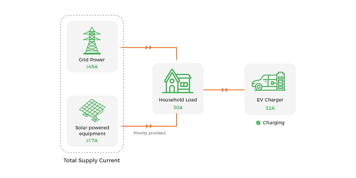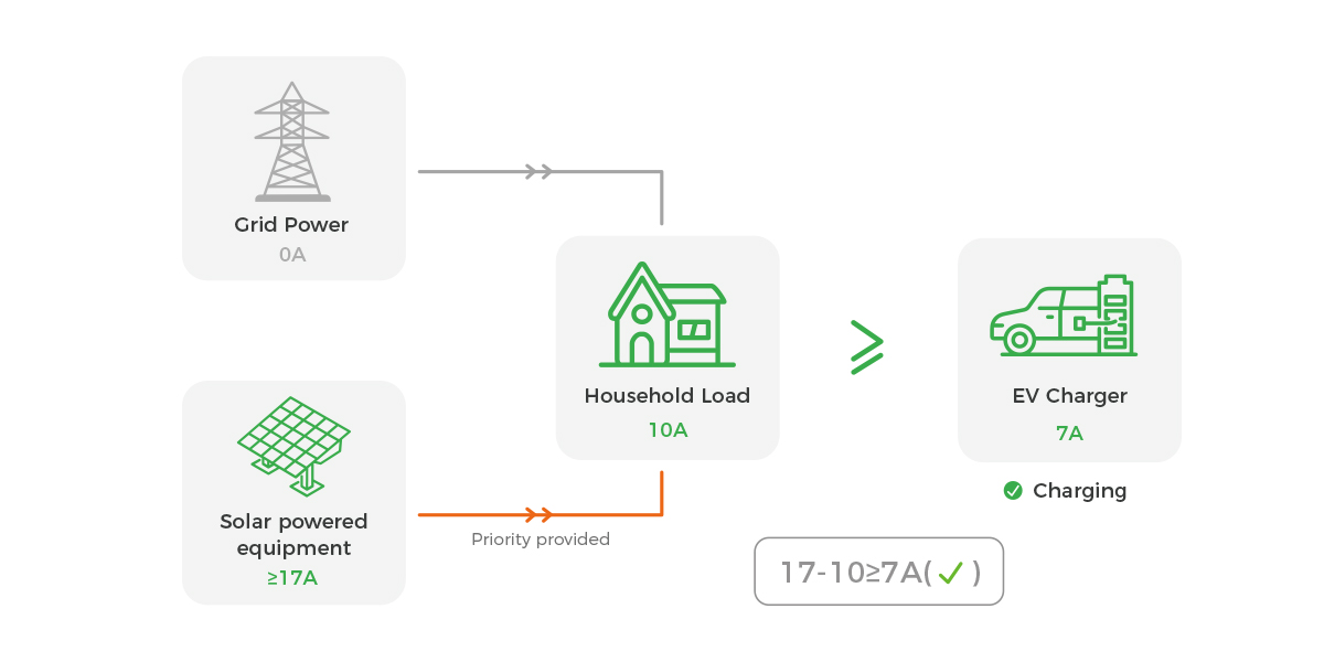 Quando un'abitazione è collegata a un sistema di energia solare, la distribuzione dell'energia può essere ottenuta tramite pinze amperometriche CT o specifici contatori elettrici RS485. Ciò consente di allocare l'energia solare in eccesso alla stazione di ricarica per l'utilizzo.